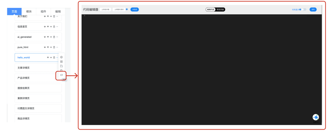 点击页面右侧的 ‘…’,并选择 代码按钮(>),点击即可打开该页面的HTML代码编辑功能。