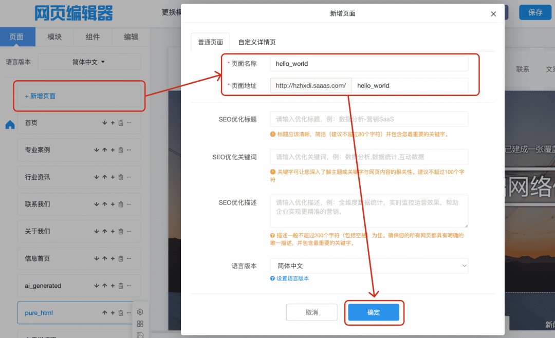 和新建其他编辑器页面一样,点击 新增页面,填入必要的信息即可
