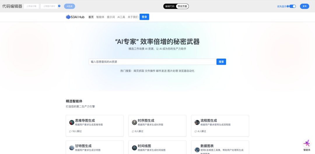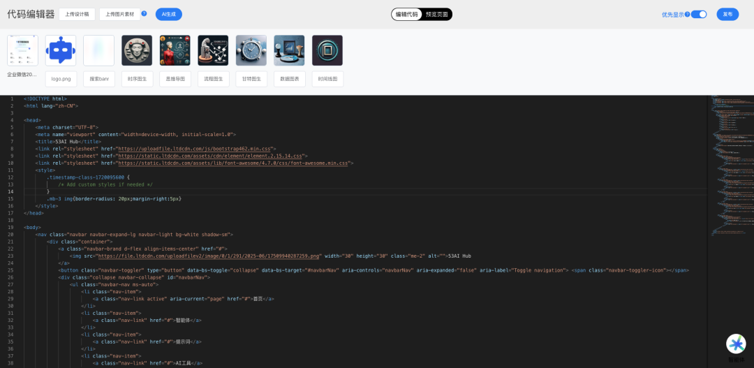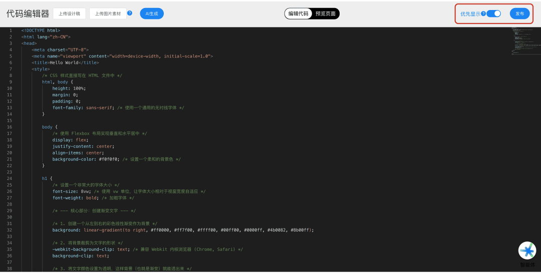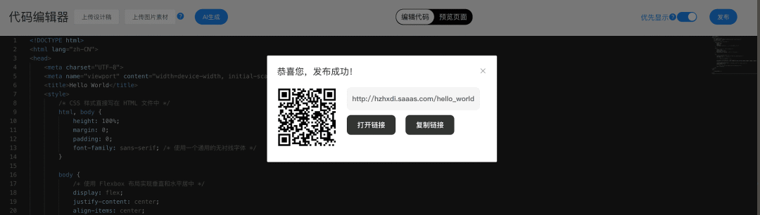 点击右上角的"发布"按钮,即可将编辑框内的HTML代码保存并自动部署。