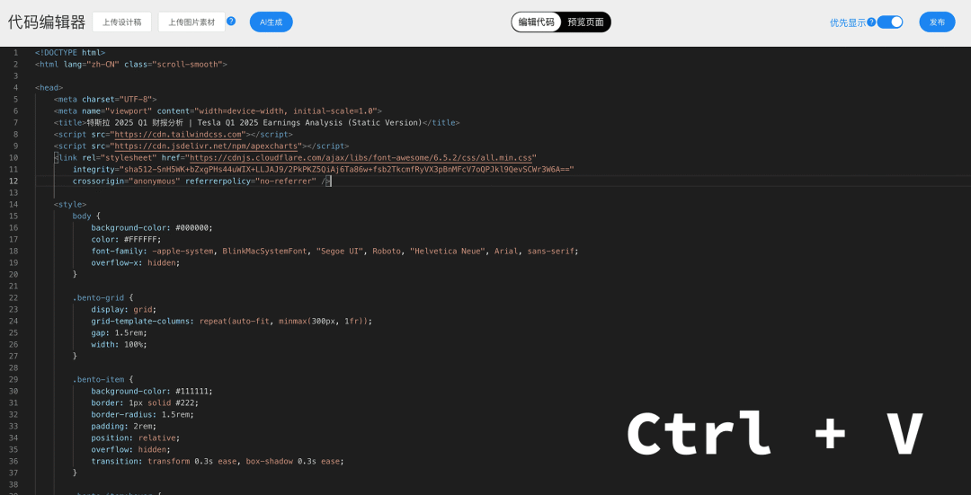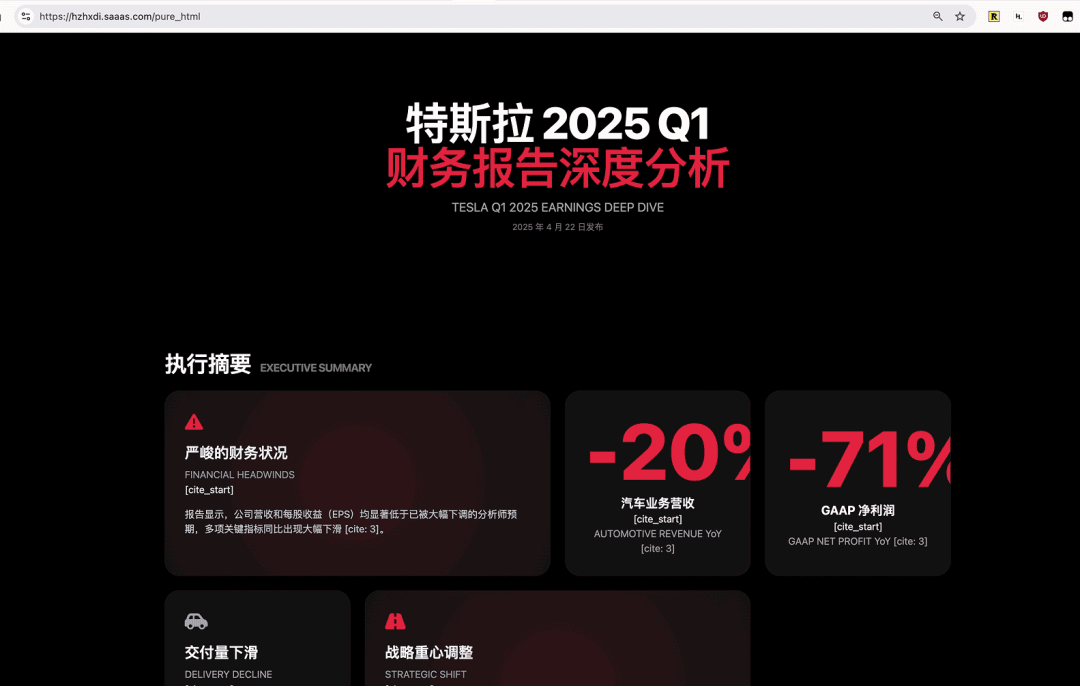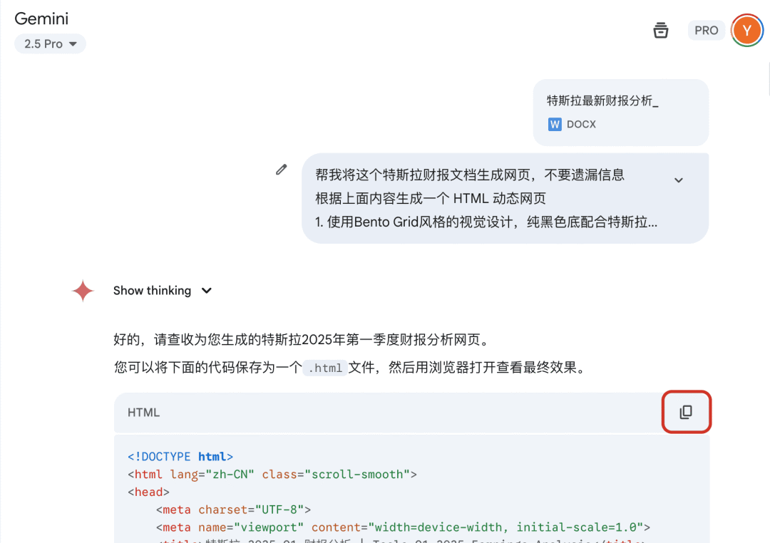 比如我们使用Gemini 2.5 Pro,通过给他特斯拉财报分析文档与HTML生成要求,让他生成HTML内容。