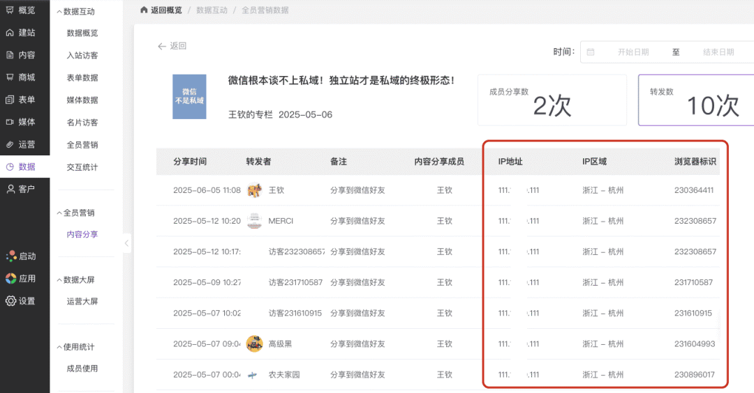 本次升级后,移动分享页在微信中的转发记录,支持查看IP地址与浏览器标识了。