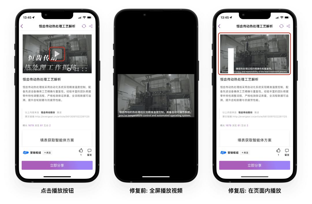 优化前,当在App中预览视频时,视频将全屏播放。优化后,视频将在页面内直接播放。