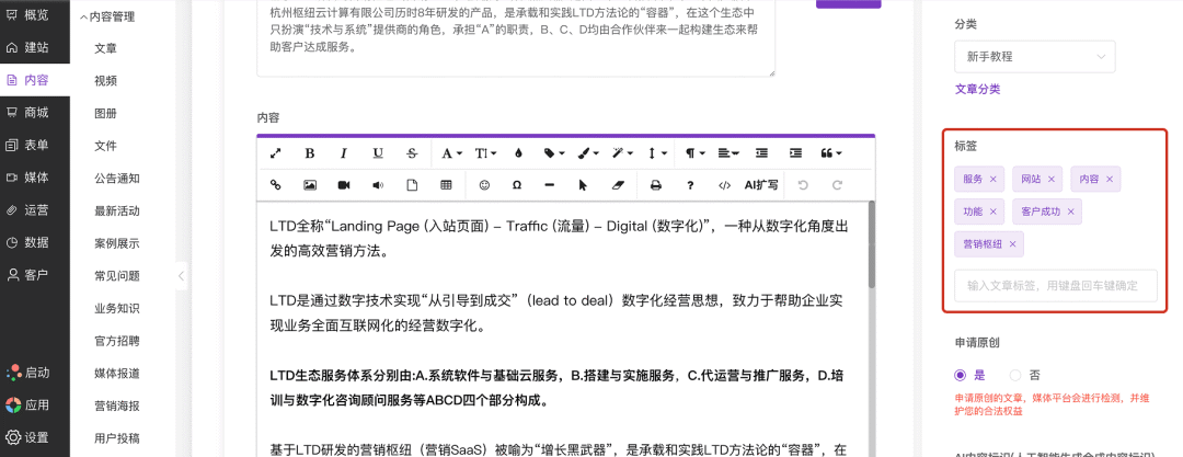 文章标签的设置入口: 官微中心 - 内容 - 文章(等) - 标签,输入标签文字并敲回车即可完成一个标签的添加。