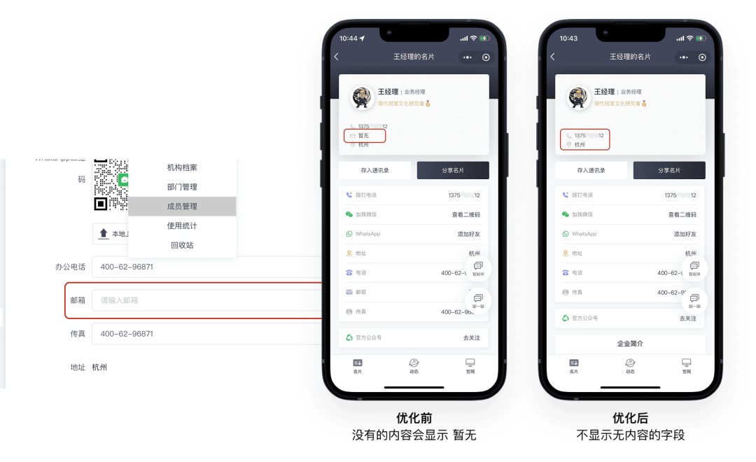 以下图为例,当这个成员没有填写 邮箱 字段时,升级前将显示为"暂无",升级后,将不显示该字段。