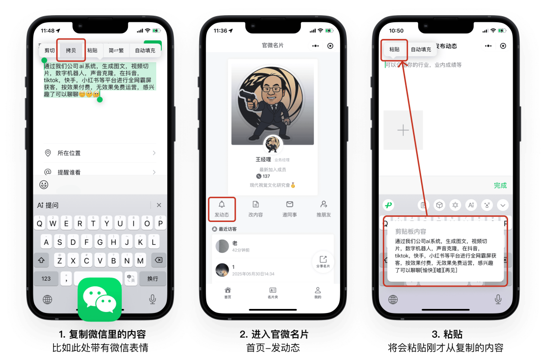 当从微信朋友圈复制文案时,微信表情将被复制为文本形式,比如[愉快]、[再见]等等。