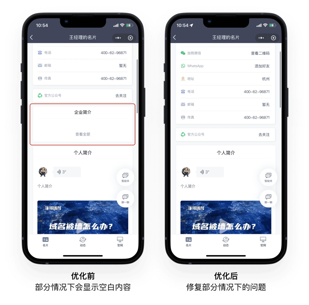 本次升级修复了部分情况下删除企业简介文字时,名片详情的企业简介版块显示为空白版块的问题。