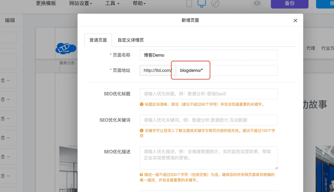 首先我们需要在编辑器中新建一个页面,并且将路径的末尾加上 /* ,来指代动态子路径。比如这里我们新增的 blogdemo 页面,我们将路径设置为 blogdemo/* 。