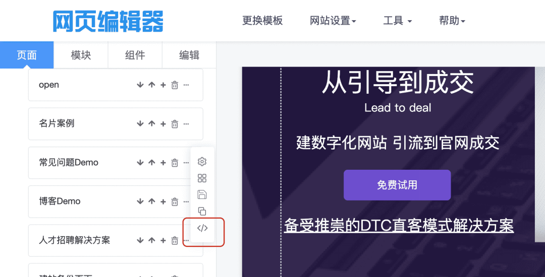 目前动态子路径功能仅用于HTML类型的页面。我们点击页面中的...来进入HTML编辑器: