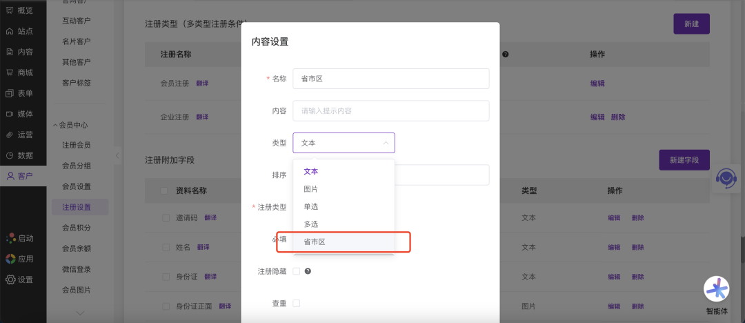 升级前会员注册字段不支持地区(省/市/区)选择,升级后支持了这一点。
