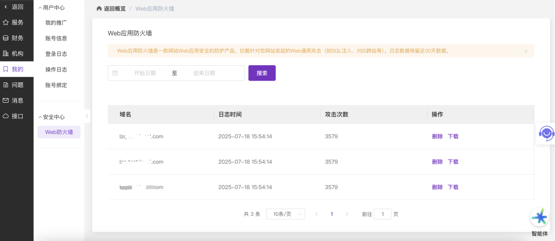 你可以通过 官微中心 - 我的 - 安全中心 - Web防火墙 来查看拦截日志(记录),该页面提供近30天数据可供下载。