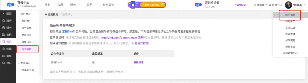 你可以通过 右上角菜单 - 账户信息 - 用户中心 - 账号绑定 来查看该页面,比如当你的账号收不到登录时的公众号验证码,可以在此处解绑后重新绑定。