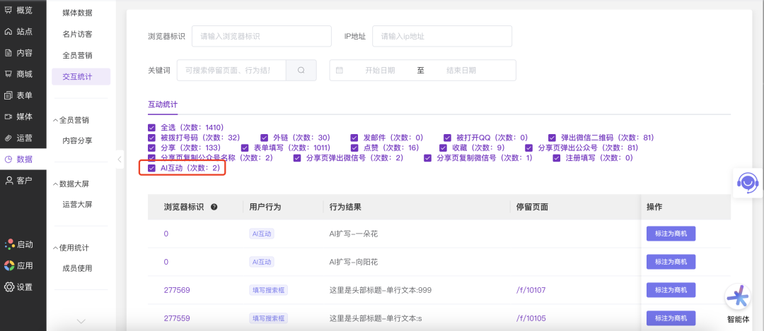 本次升级我们为交互统计增加了AI互动的事件类型。当管理员在后台使用AI扩写等操作、访客在站点前台询问AI智能体等场景时,这些互动行为将在这里可以被查看到。