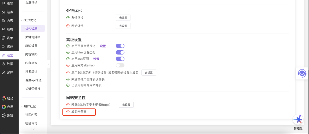 在SEO检测功能中,域名是否备案的状态,在本次升级中被列入检测标准。