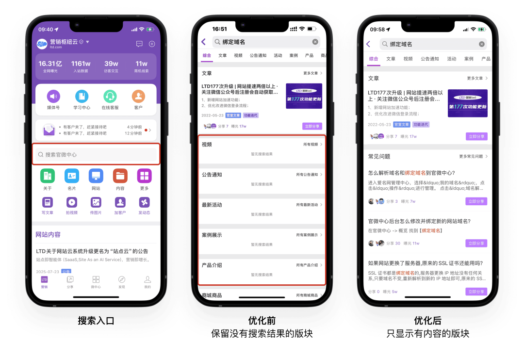 本次升级对综合搜索结果页进行了优化,升级后,将不再显示没有找到匹配内容的版块,而是只显示有内容的版块。