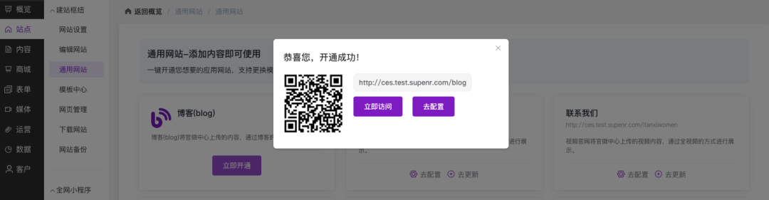 本次升级我们在官微中心新增允许一键开启站点应用的功能,本功能利用页面模板和营销枢纽的CMS系统搭建,只需要简单的开启动作,即可在你的域名下增加 博客、文档、电子相册等不同的应用。