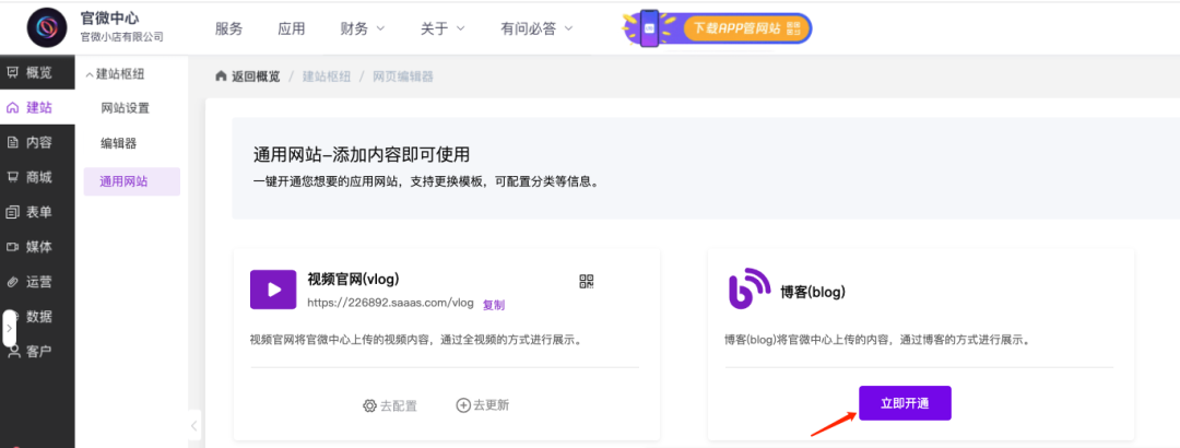 操作路径:官微中心 - 站点 - 建站枢纽,找到此处的博客。