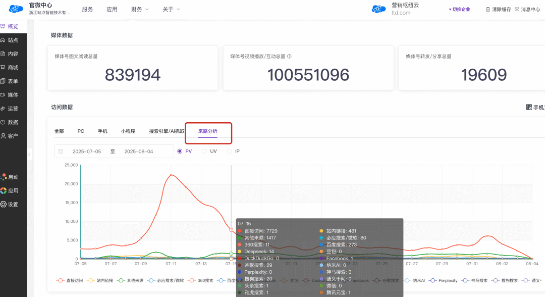 操作路径: 官微中心 - 首页/概览 - 访问数据,选择下图红框内的"来路分析"即可查看每天不同来路的访问数量。