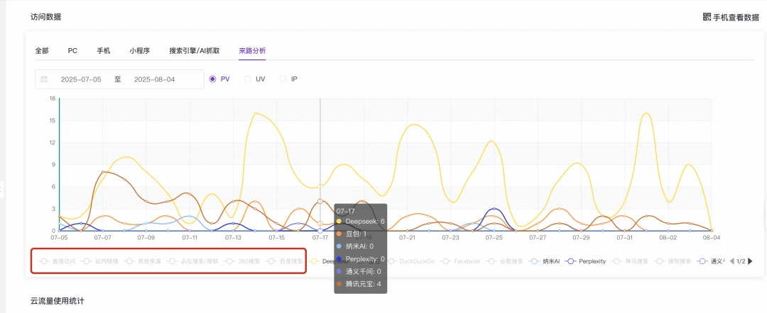 比如在下图中,我们将搜索引擎和自然流量关闭,只保留AI来源,我们就可以通过这个曲线,来分析不同的AI工具,给站点带来的引流效果。