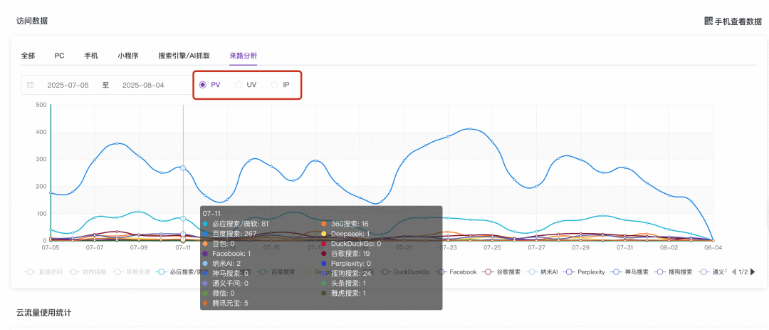 除了页面访问(PV)外,也可以通过下图红框内的PV/UV/IP切换,来查看这些来路的UV和IP数量。