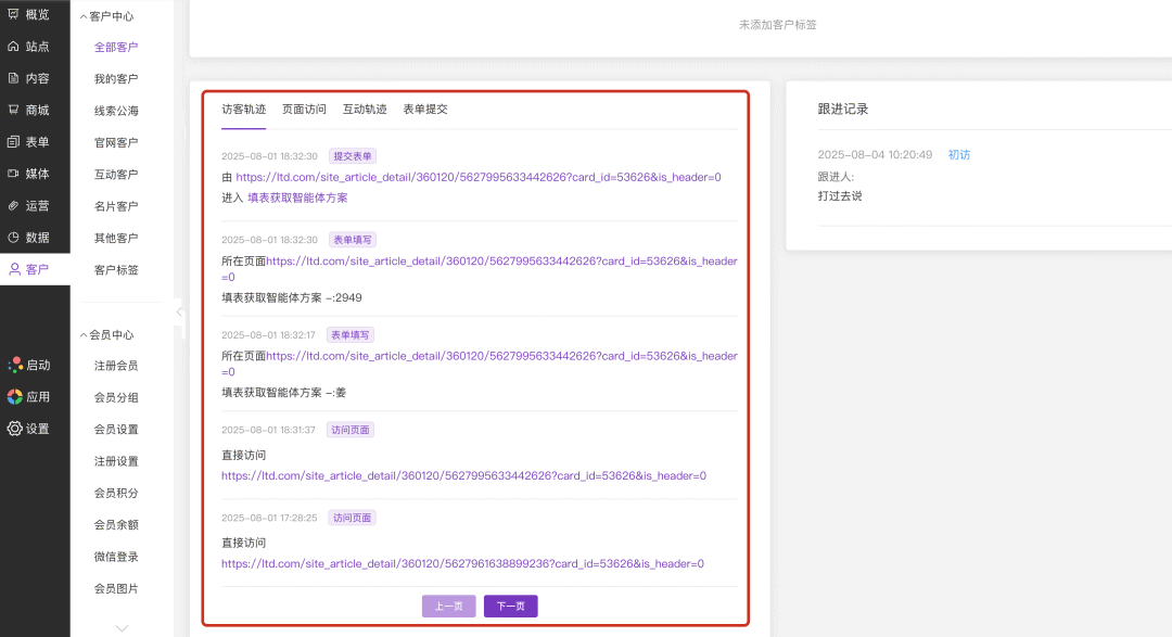在原有的客户详情页面中,访客的访问记录、交互行为(如点击、填写表单)被分散在不同列表中展示,导致难以清晰地串联起一个访客从进入网站到产生关键行为的完整旅程。这种割裂的数据视图限制了运营人员和销售团队对客户行为的深度洞察。