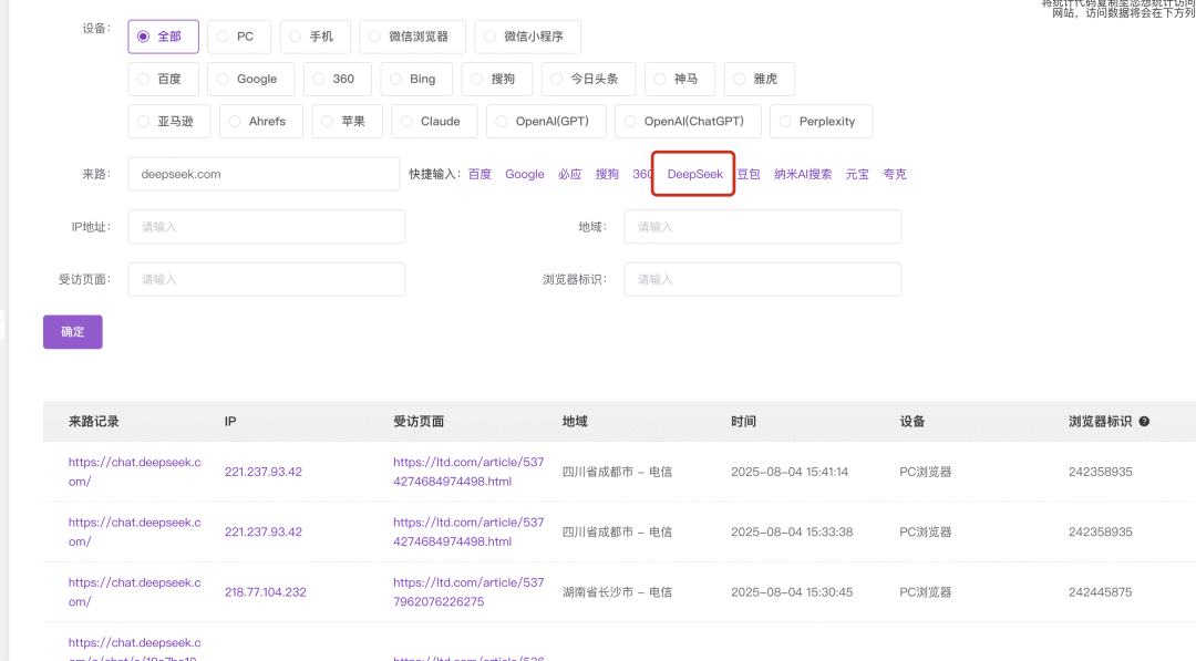 升级后,系统能够自动识别并统计来自不同渠道的页面访问,包括搜索引擎(如百度、谷歌)、社交媒体平台(如微信、Bilibili)、AI工具(如Deepseek、Perplexity)以及内链/直接访问等。