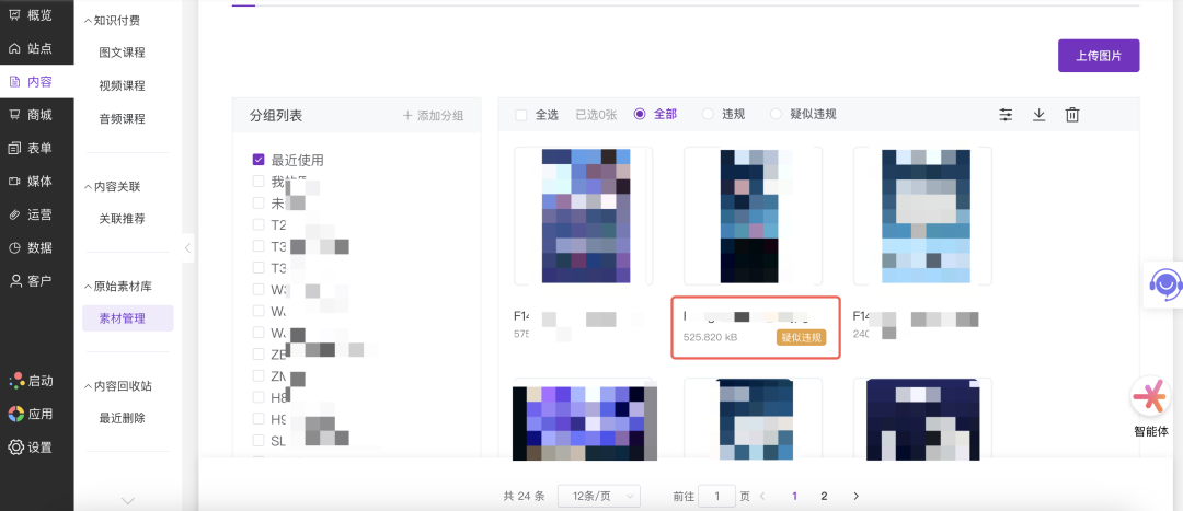 当系统检测到有涉黄、暴恐等类型的图片时,该将自动被标记为违规并限制访问。另外被检测为疑似违规的图片,将被打上疑似违规标记,需查看后决定是否需要删除。