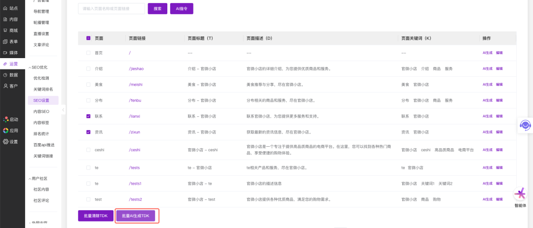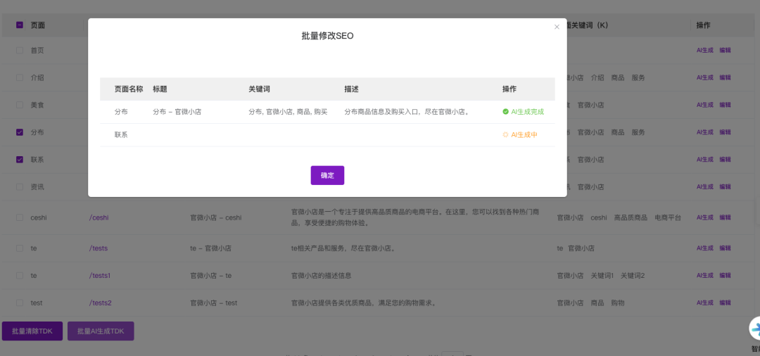 3、新增AI批量生成页面TDK功能;