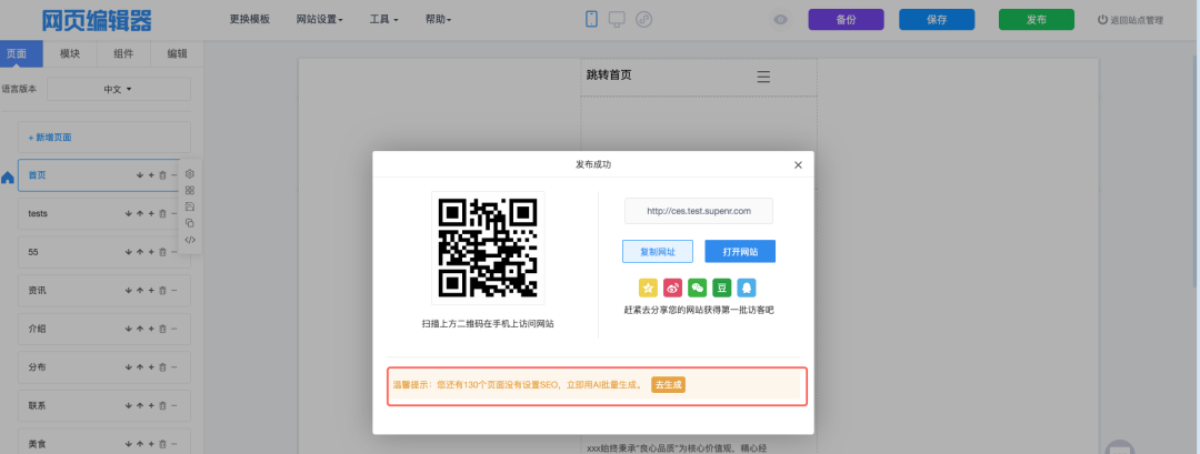 网站发布成功后,在弹窗提示中将提示有多少个页面未设置TDK,可以通过右侧按钮快速去页面列表中进行设置。