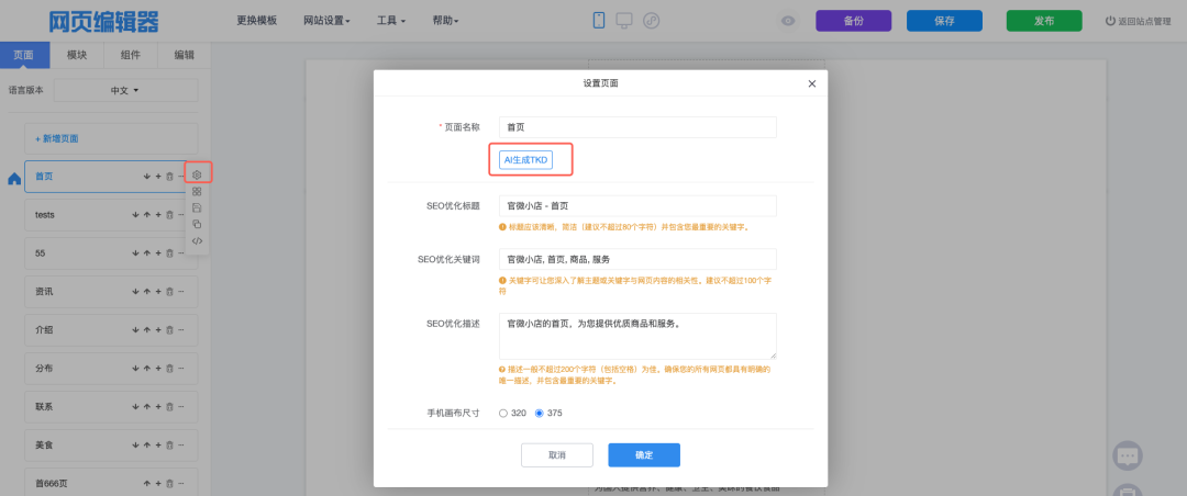 本次升级我们为网站编辑器中的页面设置增加了AI生成TDK功能;在网站编辑器中设置页面TDK时,也可以利用AI能力快速设置了。