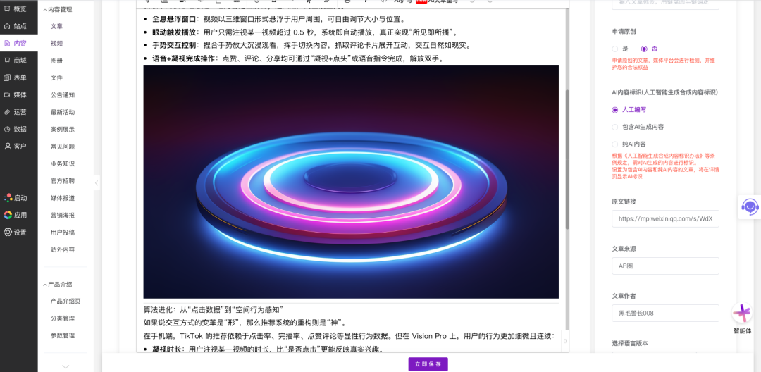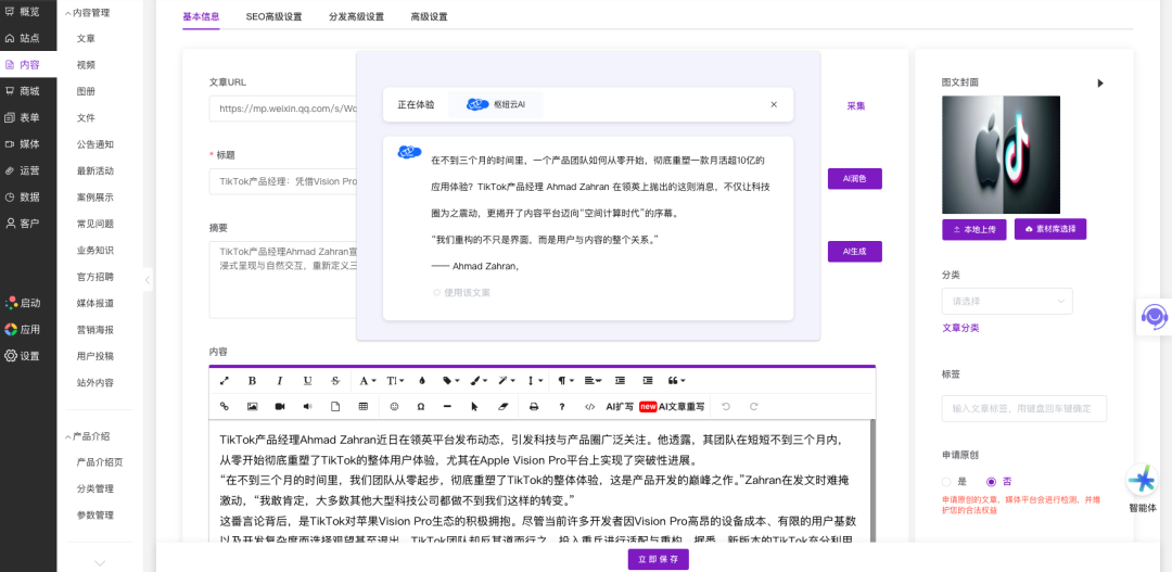 例如文章链接获取微信公众号文章内容后,可以通过此处AI重写功能,将内容改写。