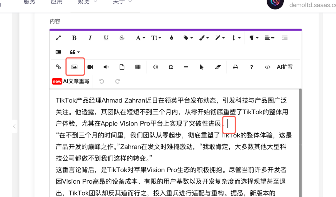 操作路径: 官微中心 - 内容 - 文章,在下图中内容编辑器工具栏里,找到 AI 文章重写 按钮。单击后,会对整篇内容进行重写。