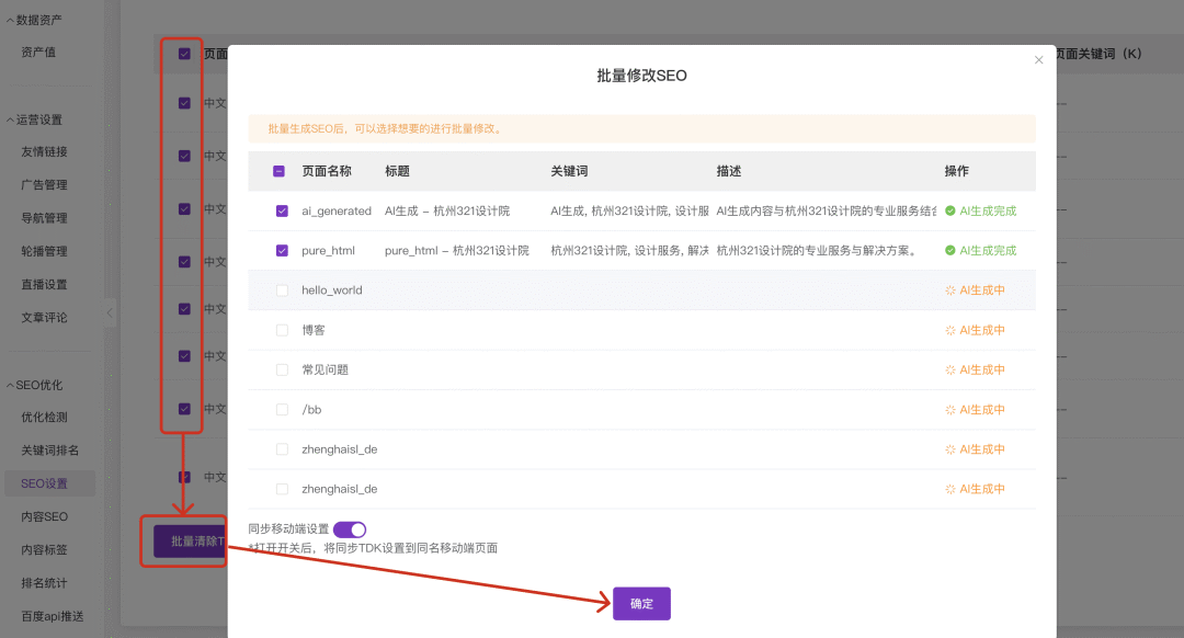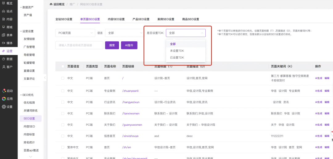 在之前升级中,我们已经在发布成功弹窗中增加"有多少个页面没有设置TDK",本次升级后,我们可以便捷打开没有设置TDK的页面,然后马上开始下一步操作。