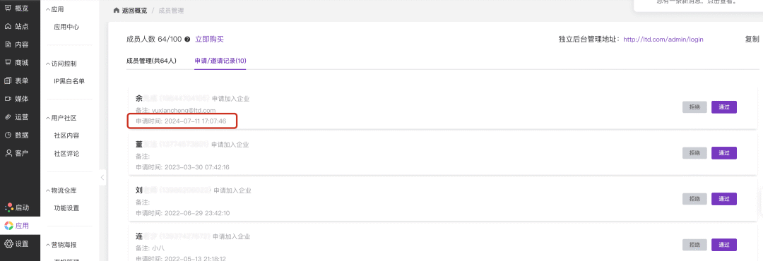 操作路径: 营销枢纽 - 关于 - 成员管理