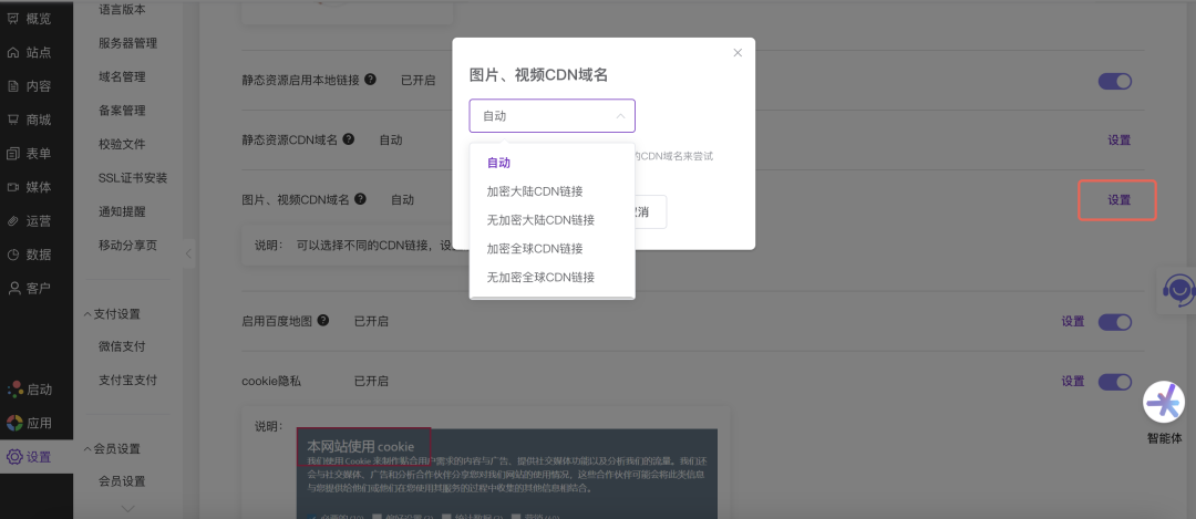 操作路径: 营销枢纽 - 设置 - 网站设置 - 图片、视频CDN域名,找到 设置,单击设置弹出如下设置页面。