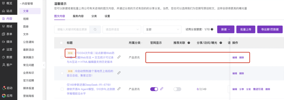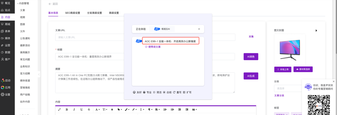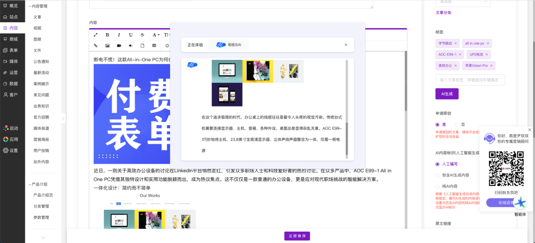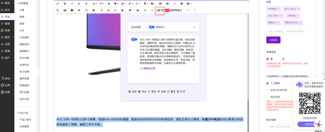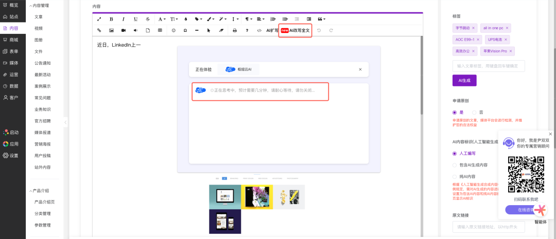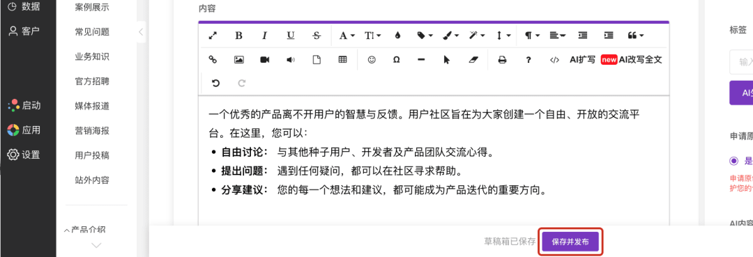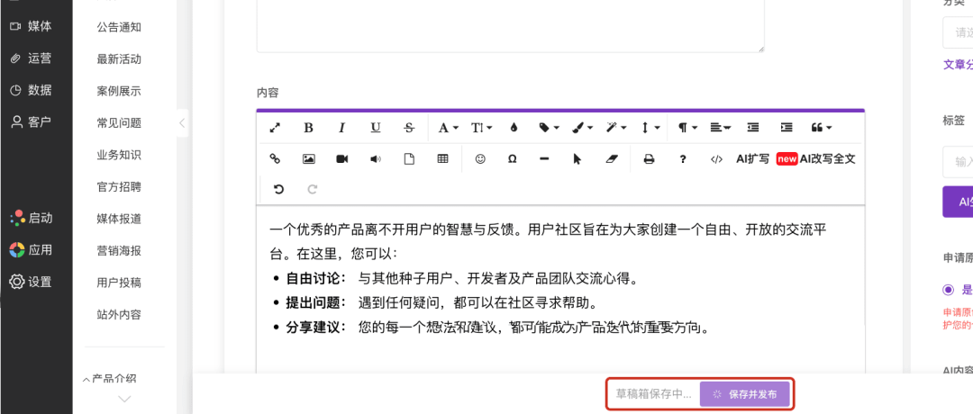 LTD341次升级 | 文章撰写过程自动保存 • 产品/商品/公告等内容添加支持AI润色 • AI自动生成商品标签