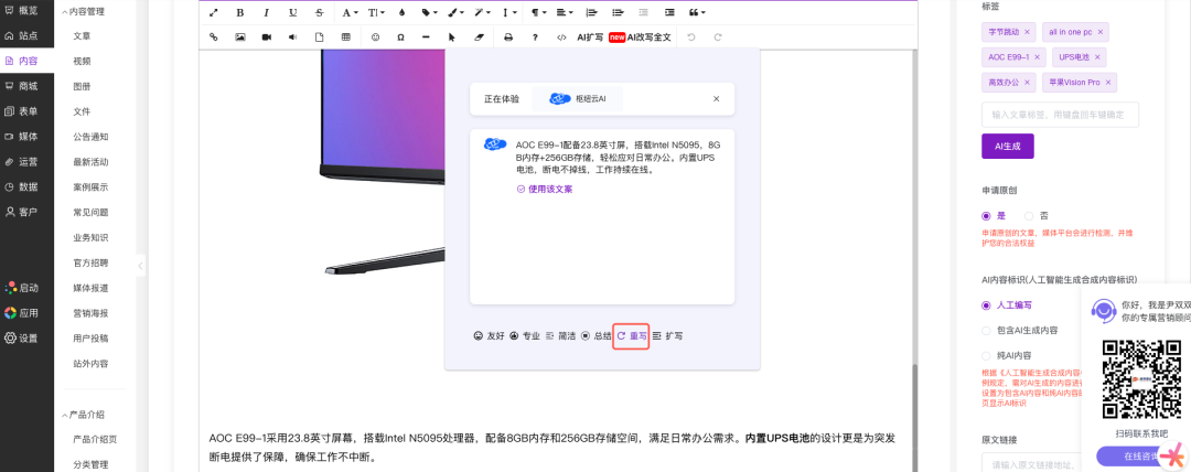 比如下图中,改写后的文章保留原始内容中图片的同时,对内容进行了重写润色。