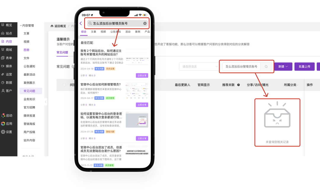 比如下图中的例子,当用户搜索“怎么添加后台管理员账号”时,基于关键字匹配的搜索结果无法找到相应内容。而App中则能够通过AI知识库,智能推荐“官微中心后台如何新增管理员?”或“添加成员后无法登录是什么原因?”等相关度更高的结果,大幅提升了信息检索的成功率和准确性。