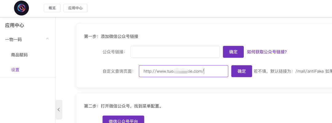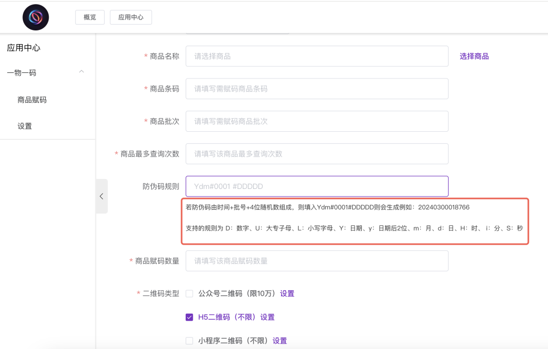 操作路径:营销枢纽 - 应用 - 一物一码,防伪溯源系统 - 商品赋码