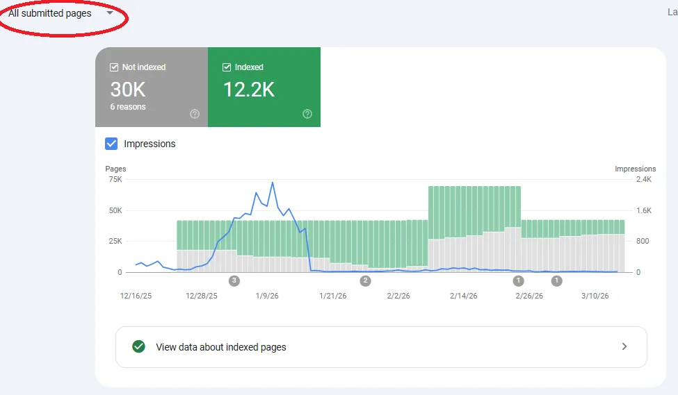 像上面这个案例是我在论坛看到的,应该是一个程序化 SEO 站点,今年以来的收录就一直在往下走,尤其是三月份数据就更难看了。